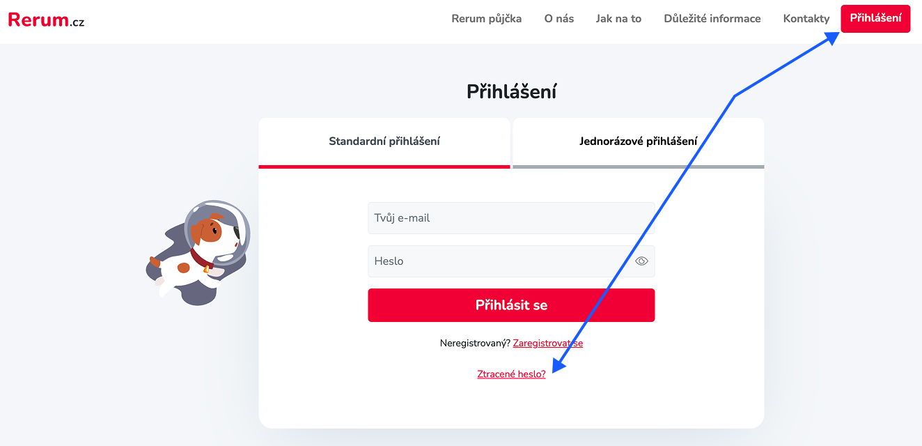 K této funkci se dostanete i z hlavní stránky – stačí se odhlásit z klientské zóny, kliknout na „Přihlášení“ a poté zvolit možnost „Ztracené heslo?“